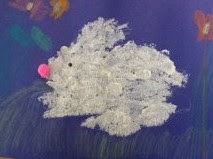 Lets make Rabbits. I've used this book in the past as a collage project with Kinders. It's a cute little book. Next the students traced the rabbit onto blue constructions paper near the bottom of the paper using a white crayon. Using construction paper crayons, students created grass remembering to color in a top to bottom motion to create the appearance of deep grass where the baby bunny might be hiding. Students used several shades of green along with brown and gray as they colored their grass. Flowers were added growing up out of the grass and around the rabbit. After all coloring was completed, students used white tempera and a small white sponge to "hop" paint their rabbits. Constant reminders to "hop" with their sponge were given during this time. Once the paint had dried, pink poms and googly eyes were added to complete the picture. These turned out really cute and are so much more appropriate as we look forward to the arrival of Spring! A larger white pom could be added to enhance the tail as well.