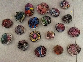 In the process of trying to complete all the projects in the remaining three weeks of school, I came upon the clay textures the other day and was scrambling for ideas on how to finish them. I did not think the marker tye dye would be as effective so went to google to find an alternate method to finish these up. All the sites I tried to visit were blocked by the district but I though I remember reading on other blogs something about oil crayons and tempera. Here are the results and I could not have been more pleased with the outcome. The students were so excited that each one showed them off to the principal! First they colored as they chose using the oil crayons. Then a quick coat of black tempera went over everything. As they dried, I rinsed them under running water and patted them dry. I think I ill replace the model magic with the low-fire clay in all of the classes next year.