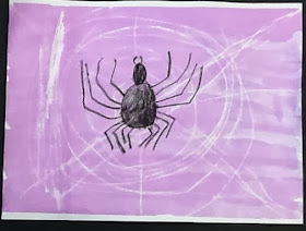 With a focus on line and shape, students then created a web using a white crayon. Vocabulary included horizontal, vertical, diagonal, and angle. A black crayon was used to create the spider with circles that are colored in slowly around the edges to become dots. The magic of the lesson occurs as a liquid watercolor wash is applied over the compositions. The students were delighted with their busy spider creations.
