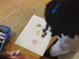 Some students were much more successful than others. This project always elicits oohs and ahhs as students are surprised by their initial success. I wasn't quite as pleased with the transfers so for the next class I layered damp paper towel between the pieces of white construction paper to try to keep them a bit more damp. Since my set up was a few hours prior to the actual class time, the paper was pleasingly damp and not too wet. Much to my surprise the students began to print on the damp paper towel. The colors were very vibrant and both the paper towel and construction paper went home as the finished project.