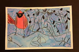 The next step involved taking a look at the vegetation outside the windows of the classroom in order to really see what a heavy frost made nature look like. Students then drew various winter dead looking plants around their birds. Black crayons were used for the drawings and also to color in the black area of the bird's face. Students using liquid watercolors to complete the composition. Kosher salt was added to the painting of the sky to make it appear as if it might be snowing. Here are a few of the wonderful completed projects.
