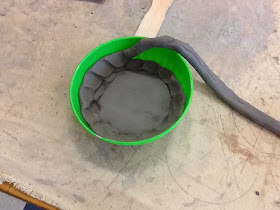 making certain to have each clay coil touch the clay below it. The snake tries to escape and crawl out of the bowl, we pinch, pinch, pinch and we turn to bowl and keep the snake "caught" in the bowl.