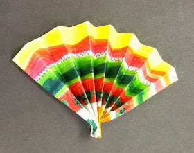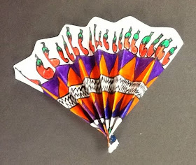 One of my buildings always puts on a school dance around this time of the year where the teachers work to raise money for the PTA. The theme for this year was Fiesta. Art students create the decorations for the dance. Fourth grades students created patterns in lively colors on white paper that had been cut into 9 x 4.5 sheets. I had envisioned them as the skirts for Senoritas but once the papers were accordion folded; they didn't quite measure up in size. The folds immediately brought to mind the beautiful fans Senoritas waved as they danced and the work took it's own life. The fans made beautiful decorations. The lesson incorporated math with the patterns along with an exposure to the culture of Cinco de Mayo with vibrant color and dance.