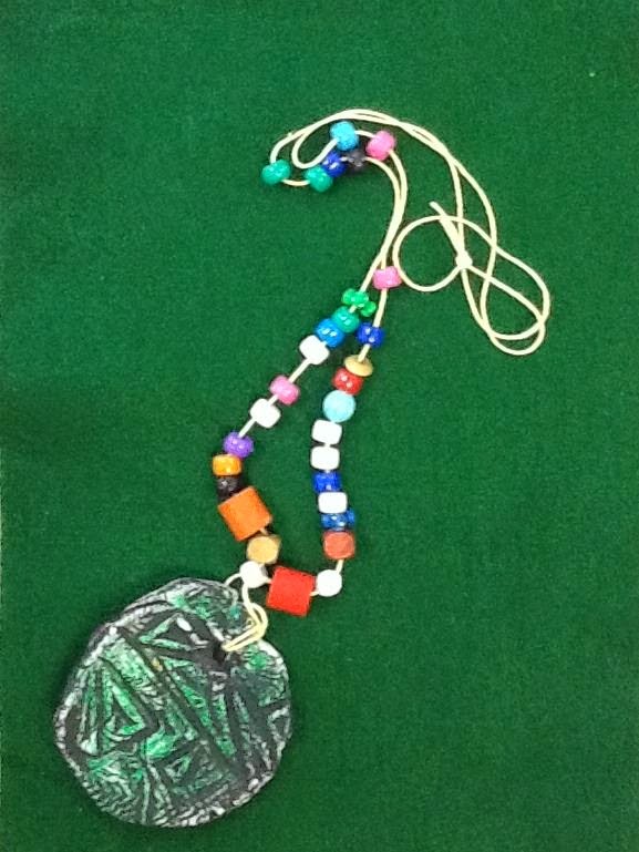 I love having Kindergarten students discover texture. In past years I have given them a ball of white model magic and they have impressed it on the bottom of a shoe to create a disk. After they water colored them or colored with markers, I glued a heavy strength magnet on the back to create a refrigerator magnet. Last year I grabbed the low-fire clay during one class when they completed a clay project more quickly that expected and created the magnets that way. They were a bit heavy for the magnets so I made a mental note to add a hole prior to the bisque firing this year to create necklaces. I had instructed students to bead a pattern but the color beads were too much for some students and they just beaded. I had handed out felt square for students to bead on. This really cut back on beads rolling off the tables and bouncing across the floor.