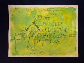 I wanted to collaborate with a classroom teacher for a writing project recently and found this idea in a book about Klee for children. Students wrote a five line poem on a subject of choice. Line one was a noun, line 2 was two colors to describe the noun, line 3 was three words to describe the first word, line 4 was four words to describe the first word and line 5 was one word that reinforced the word in line one. The ELA teacher worked with students to create the poems and then sent them to me for the art portion of the assignment. Students began by painting a paper with their two colors using watercolors. They were to be abstract in nature with students having full control over the look of their painting. Week two, students visualized their poem and created a line drawing that would represent their thoughts. These images were drawn on paper the same size as the painted work. Using carbon paper, students transferred completed images to the watercolor painting. Most of my students had not seen carbon paper prior to this experience and found the process to be magical! The poem was transfer to the image in a like fashion. I was a bit stress about the outcome of this project after the initial watercolor painting was created but the end results thrilled me. I think my students did a terrific job matching artistic interpretations to poetic work.