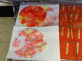Spray the filter with water which has been placed on a sheet of white paper. Place a 2nd paper on top and rub to transfer the inks to the papers. This is the printing process. You can iron them to rush the drying process or leave them to dry on your dry rack for week two. Next the students used some scrap greeting cards to create organic shapes to trace to create the petals of the poppy flowers. These were traced on the filter and printed papers.