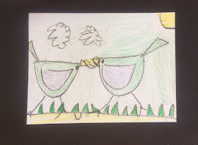 Kindergarten students experimented with shapes to create this cute composition of two early birds struggling to capture a worm.