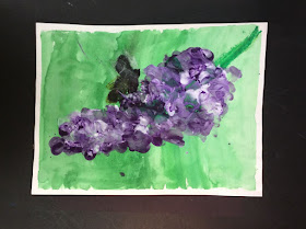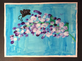 I always scan through the weekly lessons when they are updated by Artsonia.  A few weeks ago there was a post by Patty Miner of Winding Creek Elementary in Oklahoma called Purple Flowers that I knew I wanted to adapt for my students.  It so happens that I have a fragrant Lilac bush growing just outside of the art room in one of my schools.  The flowers are beautiful and of special interest to many of the 3rd graders because their classroom teacher loves Lilacs and the students pick and bring in the blossoms for her daily when they are in bloom.  I was sure I could adapt Patty's lesson for my 3rd graders and it would be a great hit.  I went out and cut a few blossoms of the Lilac for the art room as the first step and we talked about how the flowers were formed on the stems.  Week one, students used watercolor to create a background wash for the bloom.  Week two, oil crayons were used to add the stem, leaves and an insect.  Most students drew a butterfly of their color choice.  With the drawing complete, they began to finger paint first with purple paint and while it was still wet, overlaid the color with white finger prints allowing the two colors to mix.  They turned our rather nice.  If it weren't time to take down the bulletin boards for the end of school, they would definitely be on full display!  Thanks go out to Patty for the inspiration and thanks to Artsonia for a terrific program.