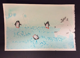 As a part of our PLC groups, I was task to connect with Science standards in Kindergarten and 1st grade.  I have searched everywhere trying to locate the source of my inspiration for this project so apologize to the person who posted it first for not referencing you here.  Students cut out shapes to form the polar bear to connect how geometric shapes are combined to create organic shapes.  Shapes and lines were used to add the small penguin friends.  The back ground was created with watercolor and a little Kosher salt.
