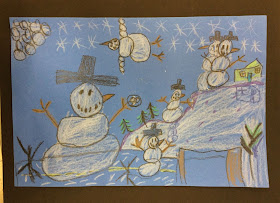 They are task with comparing their work to the poster and determining whether they have included all four methods. Because these are created in early winter, snowmen is the subject of the composition. I am really impressed with the imagination and craftsmanship exhibited by these young artist.