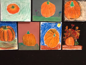 Here are some Oil Pastel creations done by 4th and 5th grade students from Observation. I purchased several of those really large artificial pumpkins on clearance several years ago. They have naturally aged and gotten slightly dirty creating different colors making them great for an observation work. Students were task with drawing a pumpkin as it looked and not stylized with a rectangle stem sticking on the top of a circle. We talked about the texture of the pumpkin and how it was not truly smooth but had irregularities that we wanted to make apparent in our work. Using oil pastels in analogous colors, students them added color and dimension to their drawing. I'm really pleased at the variety of the completed projects and how each of them hints at the 3D element of the pumpkin. They were allow to finish them as they chose which is evident in the many different backgrounds.